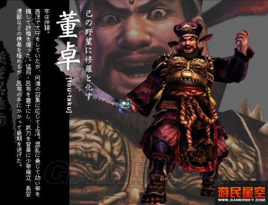 原为西凉太守,回应何进的召集而上京。趁混乱挟幼帝掌握政权。收猛将吕布为养子,挟武力废少帝,执行迁都长安等暴政。有著恶鬼的残虐与冷酷面貌的暴虐之徒。暴力且自我为尊的行动,引来乱世的恐怖。