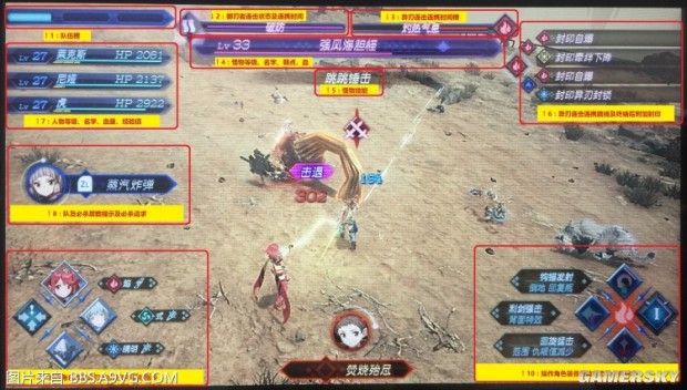 该指示条显示我方人员等级,名字,血量及经验值。注意,从上至下的顺序也是连锁攻击中依次释放必杀的顺序。