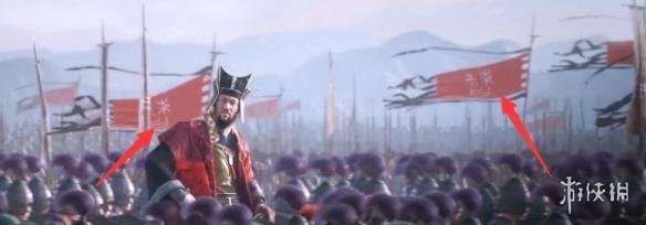 在这里我们确认这位角色是曹操,得到的证据是在下面旌旗上的篆书“曹”字: