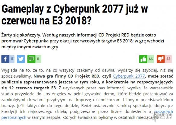 他们报道称在今年E3游戏展中《赛博朋克2077》将作为某个大型发布会环节其中的一部分展示游戏的全新预告片,并将准备一个闭本演示的demo,GRYonline的英国站称这则情报来自两个独立的舅舅党,但不肯透露是谁。