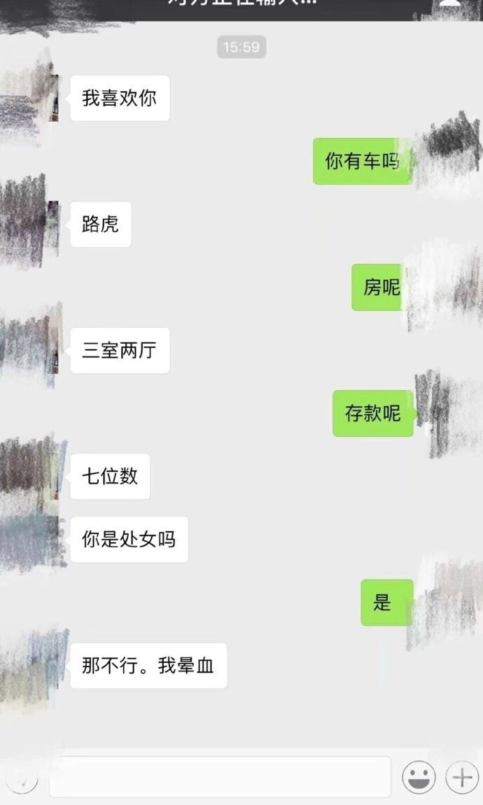 昨天,我某个博士同学被家里安排去相亲,对方穿的很妖艳,手里拿着爱疯X,头也没抬,女:“有房吗?” 他:“三房两厅,三环内” 女:“还行,车呢?” 他:“奥迪A6” 女的收起手机抬头:“存款呢?” 他:“7位数” 女的面露喜色:“工资呢?” 他:“税后月薪5位数” 女的媚笑道:“我很满意” 他:阿姨,你的女儿呢?(坊间段子)
