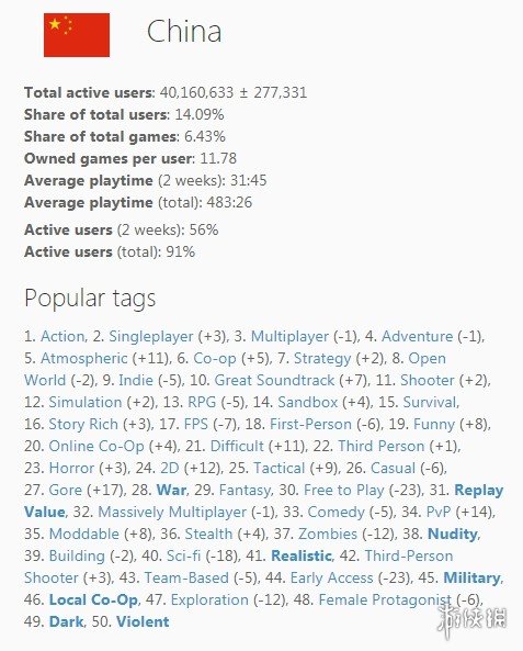 此外,数据显示Steam国区玩家在2周内的活跃数最高,游戏时长也是世界第一。
