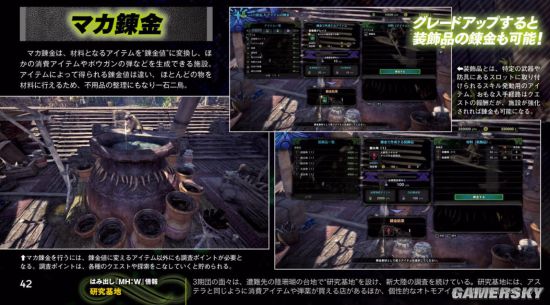 猎人除了可以装备武器和防具以外还能装备拥有技能点数的护石等装饰品。在加工屋里,交付素材和金钱可以生产和强化装备。另外,还可以替换轻弩和重弩配件,强化猎虫等等,是一个和猎人的装备关系紧密的设施。