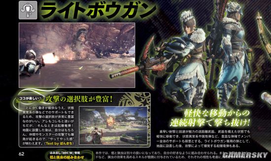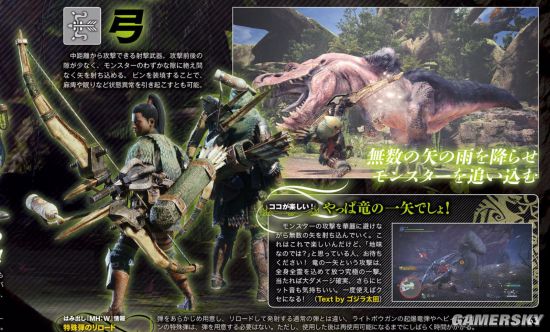 适合中距离的射击武器。攻击前后的空隙很小,可以在利用怪物攻击时露出的破绽不断持续进行射箭进行攻击。装填瓶后,可以引发类似麻痹和睡眠等异常状态。另外,本作中新加入的技能龙之一箭威力极强,但是蓄力需要一点时间。