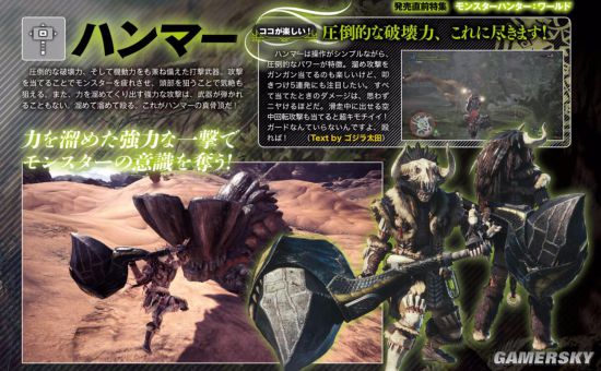 锤子是一种破坏力和机动性兼备的打击性武器。攻击怪物可以让怪物疲惫,瞄准头部攻击的话还能让怪物气绝。另外,蓄力后使出的强力攻击就算怪物的肉质再硬也不会弹刀。所以,不断的蓄力进行大地一击是锤子的真谛!