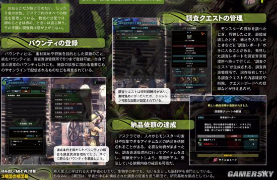 猎人领取任务的地方,除了和剧情有关联的“任务”以及可以无限挑战的“自由”以外,还可以领取报酬有随机性质的“调查”任务等,种类非常丰富。