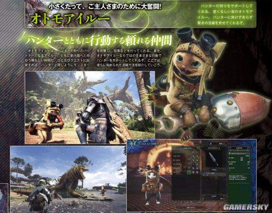 和猎人们一同进行狩猎,并且给予支援的“艾露猫”。在单人游玩时艾露猫可以和一部分怪物进行交涉让其变成伙伴,还能使用被称为“猫猫道具”的便利道具等等。是非常值得信赖的存在。另外,游戏中也为艾露猫准备了专用武具。