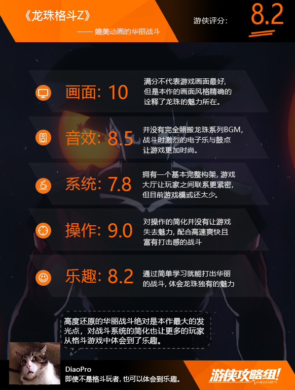 《龙珠格斗Z》简化的操作让整个游戏的战斗畅快连贯,对龙珠画面艺术风格的还原,让战斗过程十分华丽炫目,并且是一款上手门槛极低的格斗游戏。即便你不是一个龙珠粉丝,单纯喜欢格斗游戏,这款游戏依然拥有高阶技巧需要玩家反复琢磨。