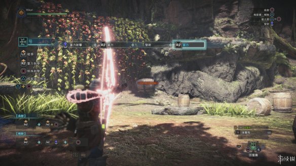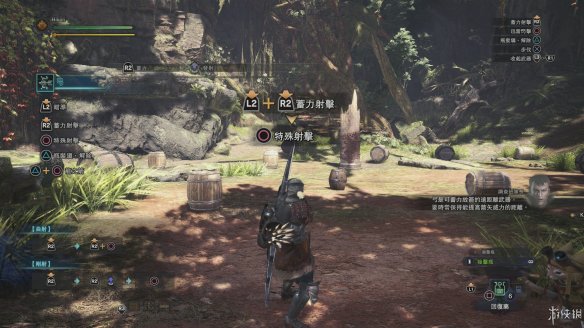 MHW中令人耳目一新的系统并不算少,其中最有趣的当属[手弩]。在本作之中,玩家的左臂携带的便携手弩不仅仅可以在采集石块后充当一个小型武器,还能够射出前作之中的各类功能弹。和远程武器一样附带瞄准并且带有辅助锁定系统的手弩使得闪光弹等战术装备的使用难度大大降低,在另一种意义上达成了狩猎的简易。同时,手弩还可以射出绳索,在某些场景中,可以用于勾住顶部枝桠,进行十分灵活的地形转换。