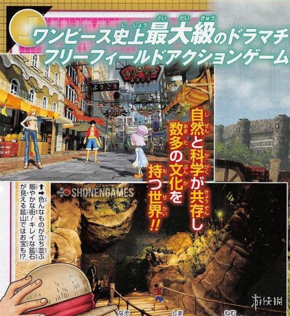 《海贼王:世界探索者》中玩家将踏上一座神秘的岛屿,在这座岛上自然和科学共存,是一个拥有多种文化的世界,杂志图中可以看到一张是繁荣的城镇,另外一张则是一个满是美丽矿石的矿山,或许隐藏着宝藏。