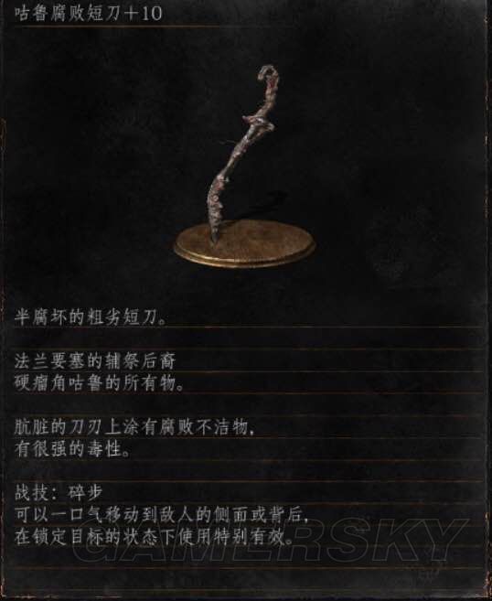 自带一个很低的暗属性伤害,不过单算物理部分,这武器在短剑类也算可以了。
