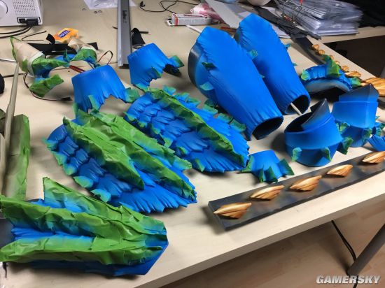 她之前在推特上发过不少制作这套盔甲的过程视频。从1月份做的雷狼龙双刀,到后面衣服、鞋子、头盔、手臂上部件,每一块都是自己亲自打造。