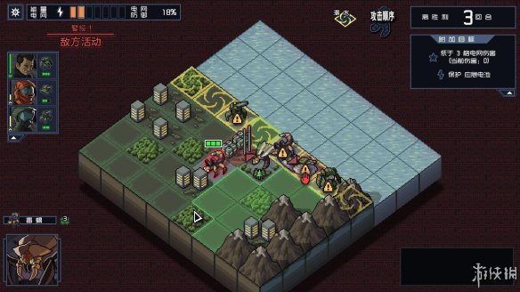 这一次的游戏关卡全部都限制在8X8的“棋盘”之中——尽管每一个关卡的通关条件、地形、敌人都会有所改变,但地图的大小是已经被限制死了,宛如一张棋盘一般,在不同的关卡只是摆上了不同的棋子。steam有一篇评论的作者Jasy提到它很像是象棋的残局,我深以为然:与传统策略游戏的公平对垒不同,在《Into the Breach》之中,玩家通常都需要面对数倍于己的敌人,并且在极其有限的行动机会里,达成各项关卡要求的条件,并在确保电网(游戏所有关卡的共通资源,一旦电网被破坏殆尽,游戏就宣告结束)的同时撑过4个回合。