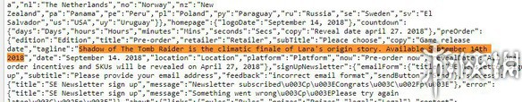 而在网站源码中,可以看到,本作就是《古墓丽影:暗影(Shadow Of The Tomb Raider)》,劳拉重启三部曲的最终章。而且信息显示发售日期为9月14日。