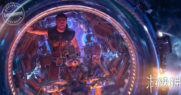索尔、火箭、沉迷电动的青年格鲁特驾驭星爵的飞船追踪灭霸