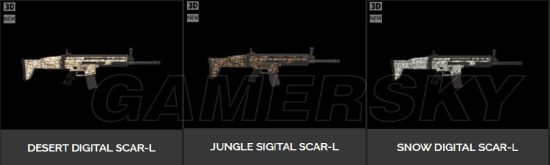 根据目前的情报,已经披露出来的迷彩皮肤一共有三种类型,其中分别是:数码迷彩(沙漠)、数码迷彩(丛林),以及与前一段时间呼声非常高的雪地地图向呼应的数码迷彩(雪地)。但非常遗憾的是这次并没有找到印有雪地迷彩皮肤枪械的高清图,如果感兴趣的话可以去谷歌一哈。