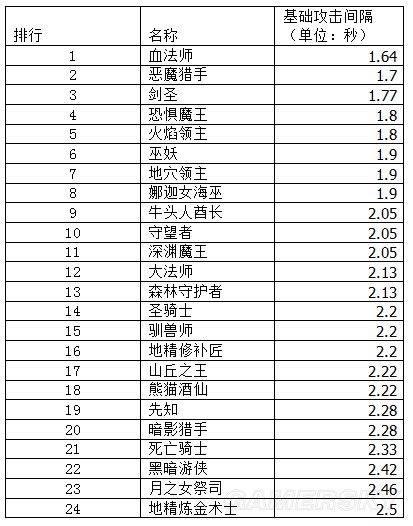 血法师1.64秒的基础攻击间隔力压一哥二哥独占魁首,很意外是不是?但实际游戏中为什么血法攻速并没有剑圣恶魔快呢?那是因为血法的敏捷太低。1点敏捷可以减少2%的攻击间隔。
