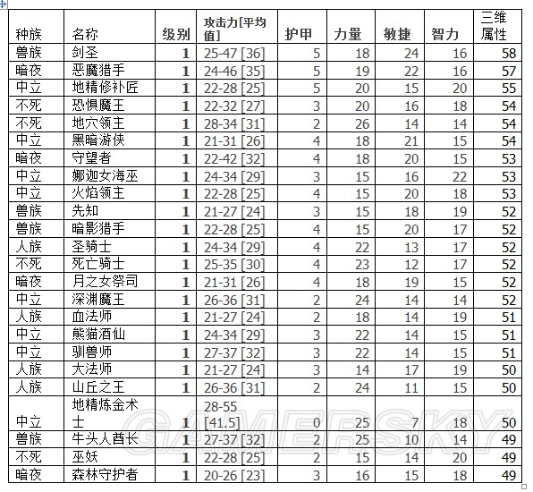 剑圣以58的三维,傲视群雄;恶魔猎手57的三维,紧随其后。除了剑圣恶魔之外的其他所有英雄平均三围为:19.5,15.2,17。魔兽英雄基本每升一级增加6点三围属性,而这哥俩一出生就比别人多六七点属性,而且还都多在敏捷上了。也就是说剑圣恶魔相当于是,从祭坛一走出来就背着个奎靴在追杀你的AM、DK——还是不占物品栏的那种。