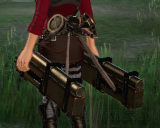 巨人的弱点是后颈处,如果不把后颈那里一条肉整个削掉的话,巨人的再生能力就不会停止。而为了这个目的开发的「立体机动装置」就是现阶段对付巨人的最佳武器了。这个装备可以射出锚钩,固定在墙壁或者树干上,蜘蛛侠应该都知道吧,就是一样的操作。腰部的装置可以喷出气体产生动力。侧面的刀鞘里装有刀片,属于消耗品,削肉专用,钝了断了没关系,再装一片新的又是一条好汉。刀鞘上面是瓦斯罐,里面装有压缩气体,是立体机动的主要动力。