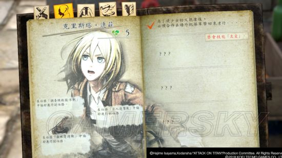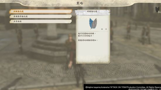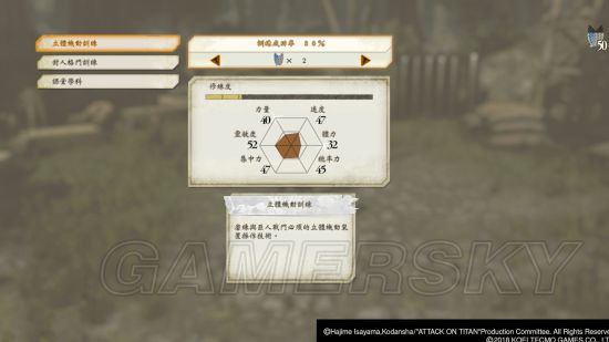 游戏中期会解锁训练功能,可以提升角色的6项属性值。具体训练内容分三项:立体机动训练,对人格斗训练,课堂学科。