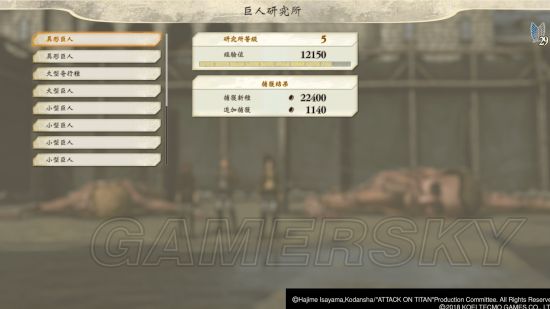 游戏中捕获的巨人会送到巨人研究所,任务后可以到这里确认,并根据捕获的巨人增加研究所的经验值,当研究所等级上升之后,就可以解锁一些新的技能和道具。另外还可以查看过去捕获到的巨人图鉴。
