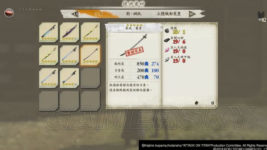 鞘·钢瓶这里我选择了咆哮鞘系列,有很高的瓦斯气压,不错的瓦斯气量,完全够用的刀刃携带量。因为本作中设置据点就会补充刀刃瓦斯,而据点到处都是,所以消耗应该不用太过担心,选择装备就优先选速度快(气压高)的就好。虽然这样说,但是刀身50耐久、鞘只能装1片刀刃的这类装备我还是不敢用,高手的话可以尝试挑战一下。