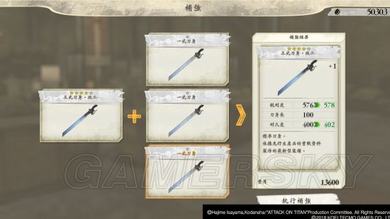 - 补强:用最多三件任意装备作为素材,强化基底装备的操作。与改造不同,作为基底的装备不会改变,只是属性会被加强。简单来说,就是网游中泛滥的装备强化系统(一言不合就+99)。虽然用低稀有度的素材会变得不易提升,不过至少还是会+1,所以一般来说是以量取胜,毕竟1星的一式装备只需要配备书·通用即可,刷就一个字。值得注意的是,虽然我还没有补强,不过根据前作来说,先把素材强化到+99再去强化装备要省钱得多。后期还会有「七色水滴」这种特殊素材可以让装备突破+99,继续强化。