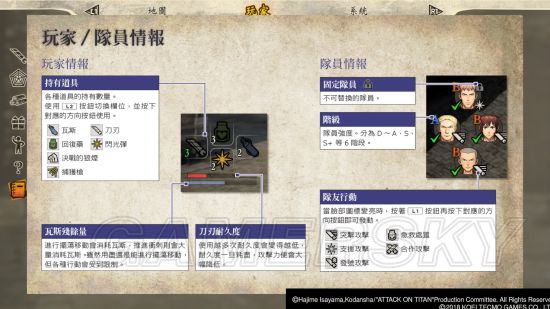 简单说一下,界面里没有血条,因为角色只有两种状态:没负伤、负伤。左侧是队友信息,左下是道具栏,道具栏下面分别是是刀刃条和瓦斯条,右侧是任务目标,右下是小地图。队友和道具下面会介绍,这里主要说一下警戒度。警戒度有三个级别,白色、黄色、红色。当巨人察觉到玩家的时候警戒度会从白色涨到黄色,变成黄色后巨人就会以玩家为目标攻击,当继续与巨人缠斗,警戒度会涨到红色,变成红色后巨人会进入「危险状态」,可以理解为发怒,攻击力和行动速度都会大大加强,名副其实的比较危险。奇袭被发现的话巨人进入的就是这个状态。危险状态会随时间慢慢降低,之后重新变成黄色警戒度。