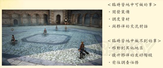 另击模式的营地非常简洁,分别有换装、打造、资材调度、战马的功能,背后还有个接任务的NPC,通关剧情之后还有增加一个高难度调查任务的NPC。