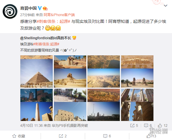 微博信息:感谢分享#刺客信条:起源# 与现实埃及对比图!阿育想知道,起源促进了多少埃及旅游业呢?