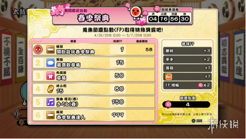 于活动期间游玩太鼓线上排名战模式将可获得节庆点数 (FP),也可使用3枚咚小判启动「FP增幅」效果,将获得加倍的节庆点数(FP),以兑换下列奖品: