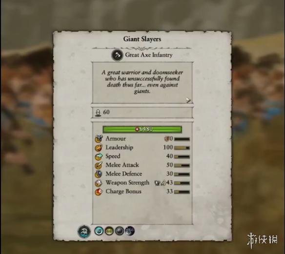可以看出这个兵种是一个擅长近战,领导力优秀,但防御能力很弱的兵种单位。具体特征能力如下:护甲:0、领导力:100、速度:40、近战攻击:50、近战防御:30、武器强项:43、冲锋加成:33