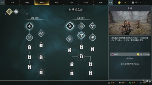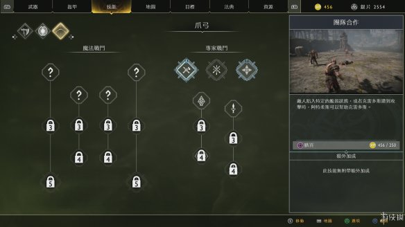 之前的战斗系统配上这最后的技能部分才是本作战斗部分的完全体,游戏中奎托斯与阿特柔斯都有各自的技能树,当武器等级达到要求后,就可以使用XP学习。奎托斯的技能部分包含利维坦之斧的的近距战斗、远距战斗,守护者之盾的盾牌战斗,斯巴达之怒战斗。阿特柔斯的部分则是弓箭及魔法战斗。