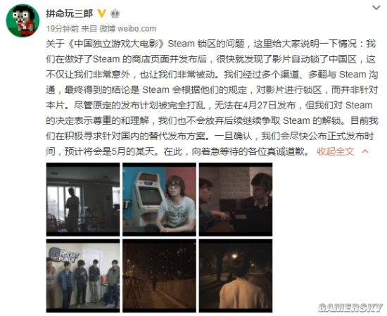 今日,拼命玩三郎在微博上对这件事进行了具体解释,他表示《中国独立游戏大电影》锁区并非是被针对,而是Steam规定所造成的。而他们也会继续争取本片在Steam上进行解锁,而他们也在寻求国内替代发布方案,预计会在今年5月份正式发布。