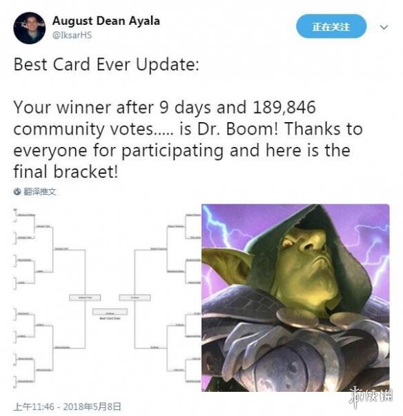 Dean Ayala昨日在推特上宣布,经过9天票选、189846名社区玩家的投票,砰砰博士获选“最佳卡牌”。本次票选活动中的四强对阵中,守日者塔林姆击败终极感染,与击败索瑞森大帝晋级的砰砰博士会师决赛。最终还是砰砰博士更胜一筹,获选“最佳卡牌”。
