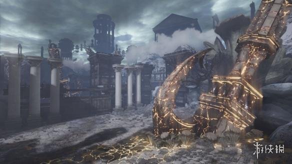 另一张图片中在远处的云雾中则漂浮着巨大的牢笼状的建筑,在牢笼的背后则是一座座古希腊风格的宫殿,或许就是传说中的12宫?而这些漂浮的“牢笼”向下抛出闪耀着金光的巨锚,疑似就是本作中希腊众神侵略中原or日本大地而引发战争的导火索。