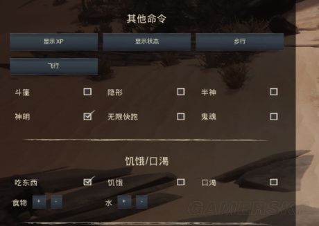 之后将管理界面的,“神”,“无短跑消耗”勾选上,这样就是无敌+无限耐力,然后点击“食物”和“水”后面的加号,达成条件2,3。