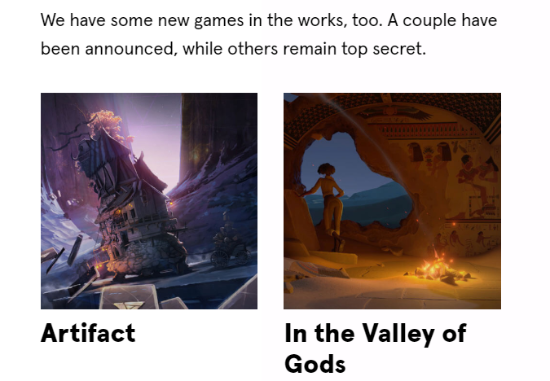 V社全新官网上线,相较于以前风格大变,更具有现代感。其中还明确提到,V社目前正在开发多款新游戏,其中一些已经公开,比如《Artifact》和原《看火人》团队制作的《众神之谷In the Valley of Gods》。而其他另一些则处于绝对保密阶段。