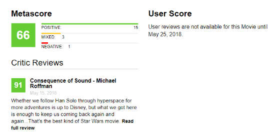 《游侠索罗:星战外传》即将上映,媒体评分已经解禁。MetaCritic目前汇总19个评价,均分66。其中IGN评分7.0。