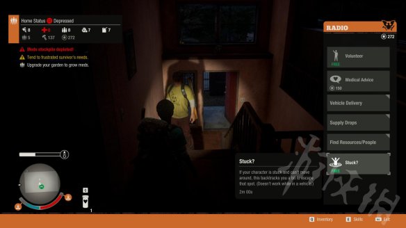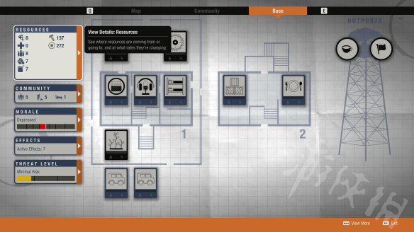 当然,如果仅仅是能分别扮演角色,或者是单纯的打打丧尸玩玩物资收集,本作也不会赢取大片声誉。在《腐烂国度2》的世界中,资源的获取与人口之间的矛盾很多时候会带来如同小说一般的故事演绎。人口稀缺时,成员的负担沉重,且会遭受更大的防御与生存压力;而人口增加,又会显著提高资源的消耗速度,角色之间也许还会因性格问题发生摩擦。更不要说外出时基地随机事件导致丢失资源时带来的困扰。想方设法优化基地设施,提高核心资源获取速率,来保证社区的士气持续处于稳定状态,是游戏进程中的主要课题。——而在事态变得糟糕的时候,恐怕你不得不缩减团队规模,或者是做些强盗营生,来让团队踏入野蛮的丛林。