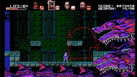 动作3:当两颗龙头都爆掉后会合而为一并从画面左侧出现,底下会铺满龙的身体,碰到会受伤但不会即死,龙头会蓄力吐火。