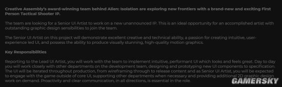 世嘉旗下制作组Creative Assembly曾在2014年打造了恐怖游戏《异形:隔离》,而近日他们又有一款FPS新作曝光。在官网上Creative Assembly正在招聘一位高级UI设计师,而他的职责就是负责一款未公布全新作品的UI设计工作。