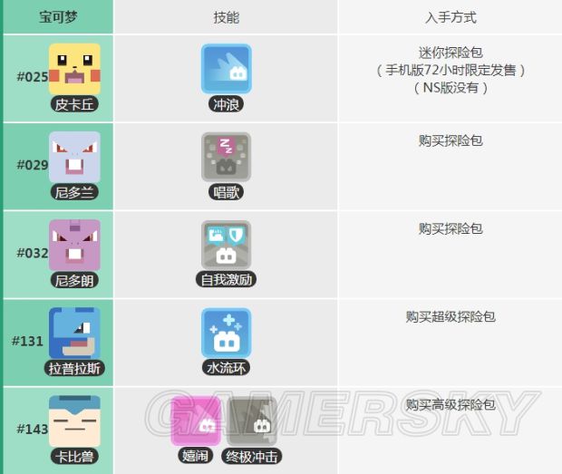 通过购买商店的探险包可以获得几只拥有特定技能的宝可梦。