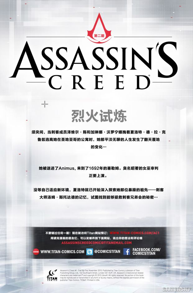 《刺客信条:刺客》系列漫画分三个故事,第一个故事“烈火试炼”发生在十七世纪末,塞勒姆女巫审判期间。现代女刺客夏洛特通过Animus以其祖先的视角经历了这一惨剧的发生。本次发布《刺客信条:刺客》之烈火试炼第2期,后续章节将陆续发布,敬请期待!