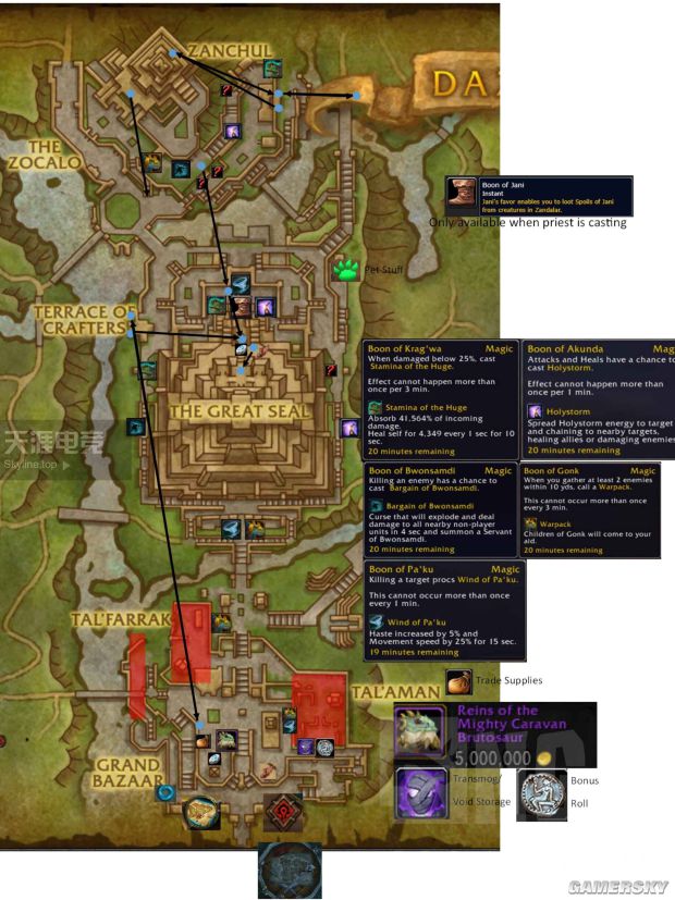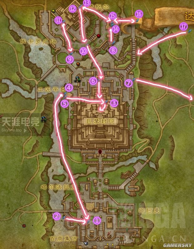《魔兽世界》祖达萨主线任务中,如果loa神选择了帕库,那么将会开启17个可快速穿越主城各位置的飞行点,不过具体的路线游戏中并未注明,下面小编带来“喃兑啊内”分享的《魔兽世界》帕库飞行点图腾位置图解,赶紧来了解一下吧。