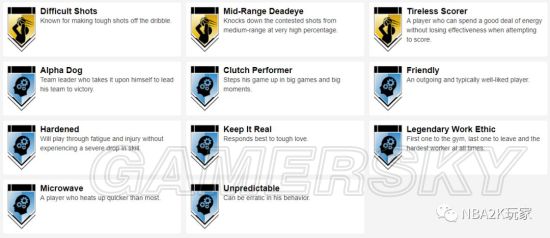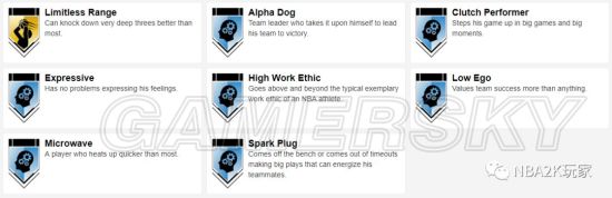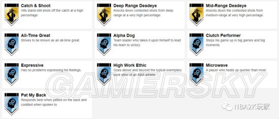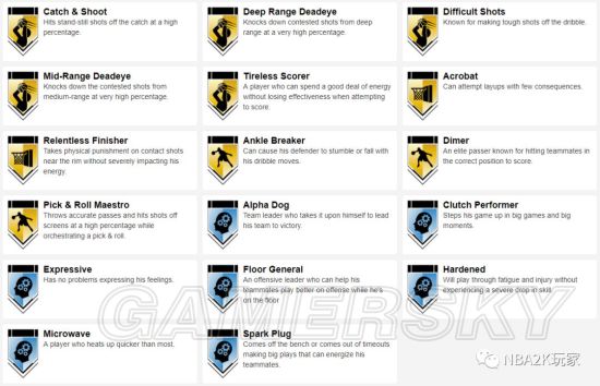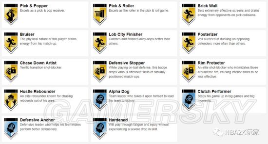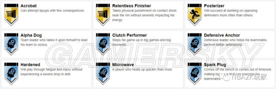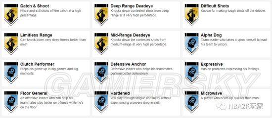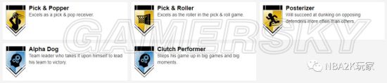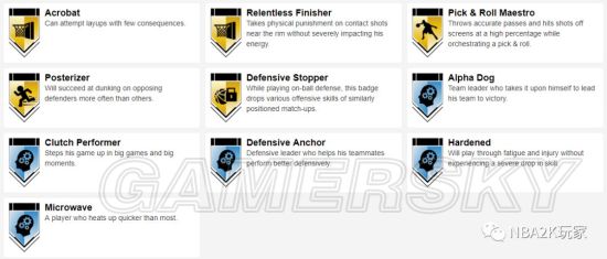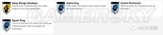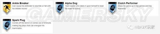 十枚金徽章实用的偏向于投射和组织类,接球投篮、远距离,中距离、十美分等均在列,此外还有一枚脚踝终结者徽章,195的身高在后卫线上丝毫不落下锋,在这一代冲扣较难的情况下,这张卡是一张非常实用的双能位球员卡。