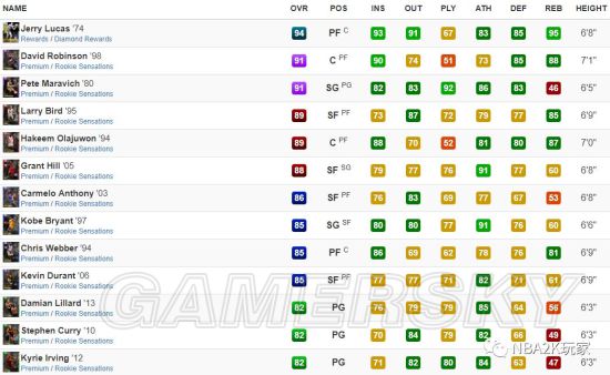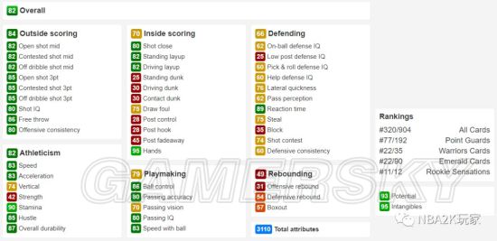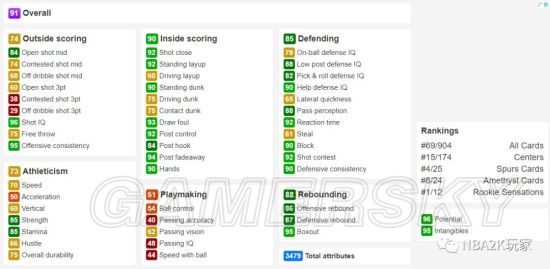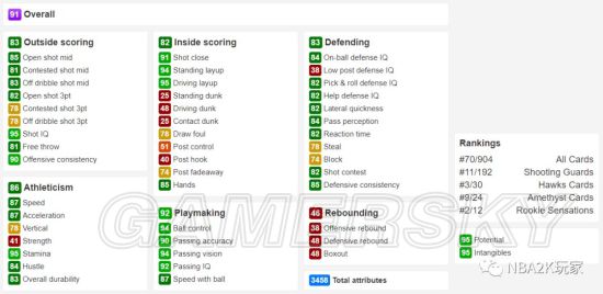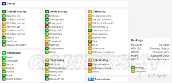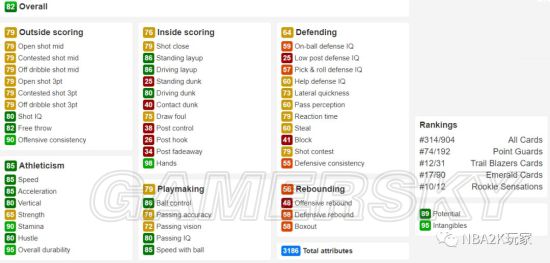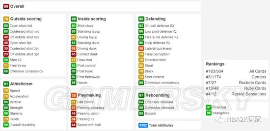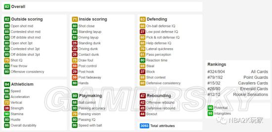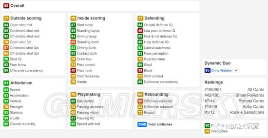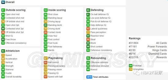 作为一名黑粗硬,内线进攻方面几无短板,背身进攻能力虽没有上面的钻卡高,但也非常出色,背身后仰高达94;投射能力稍稍逊色,仅有空位中投一项在80以上,三分属性均在60以下。防守端综评85,没有什么明显的缺陷,作为一名215的中锋来说横移65也算合格了。篮板能力综评88,比较优秀的篮板属性。