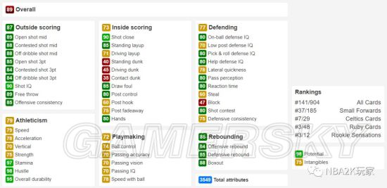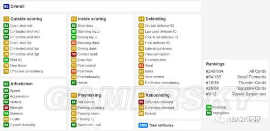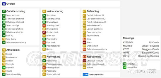 有着一定的背身能力,背身控球给到了80,背身后仰为75。自主进攻能力有限,因为今年容易被抢断,尽量减少用这张卡持球进攻的时间。防守端表现中规中矩,不求有功但求无过,没有什么明显缺点但也没有突出项,硬要说的话,篮板能力尚可,一名205身高带着85篮板属性的小前可以在一定程度上分担点内线压力。