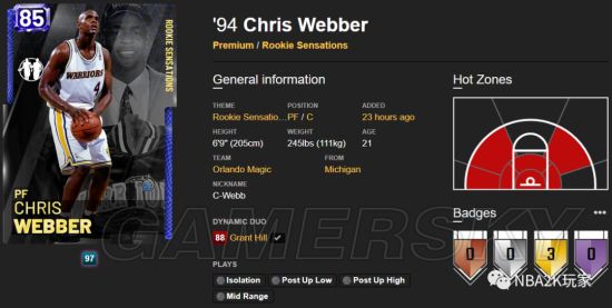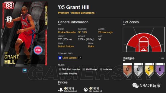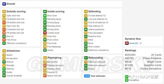 格兰特希尔,这张卡的属性总值为3568。六大项中最为突出的是他的运动能力,综评高达91,由此我们也可以知道他进攻端是以冲击篮筐为主,冲扣达到了93,隔扣也有85。投射能力稍有一些,中距离在线,只是三分不能作为他靠谱的进攻手段,空位时可以投一投。虽然这张卡主冲框,但给的控球并不算高,80的控球要求玩家朋友在使用他的时候一定要高效,否则体力下降后很容易被断。