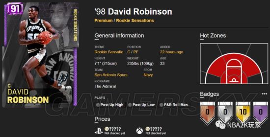 海军上将相信就不用给大家多做介绍了,让我们直奔主题吧,这张大卫罗宾逊紫卡属性总值为3479,大项中有一项高光,两项绿区,两项黄区和一项红区。